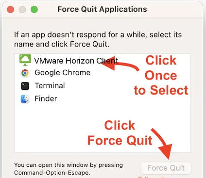 - In the “Force Quit” window check if VMWare Horizon Client is there, if it is then force close the application, if not then skip to step 4.