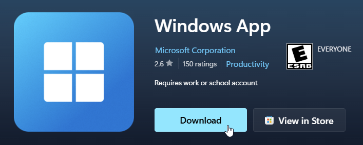 The Windows App is available from the Microsoft Store and can be used to install on Windows 10 and 11 systems.