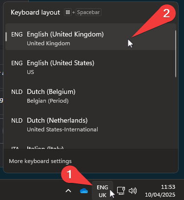 Upon logging into AVD you will notice in the taskbar in the bottom right next to your network connectivity and time the currently selected keyboard layout. To change this simply click on the icon and change it to your desired layout.