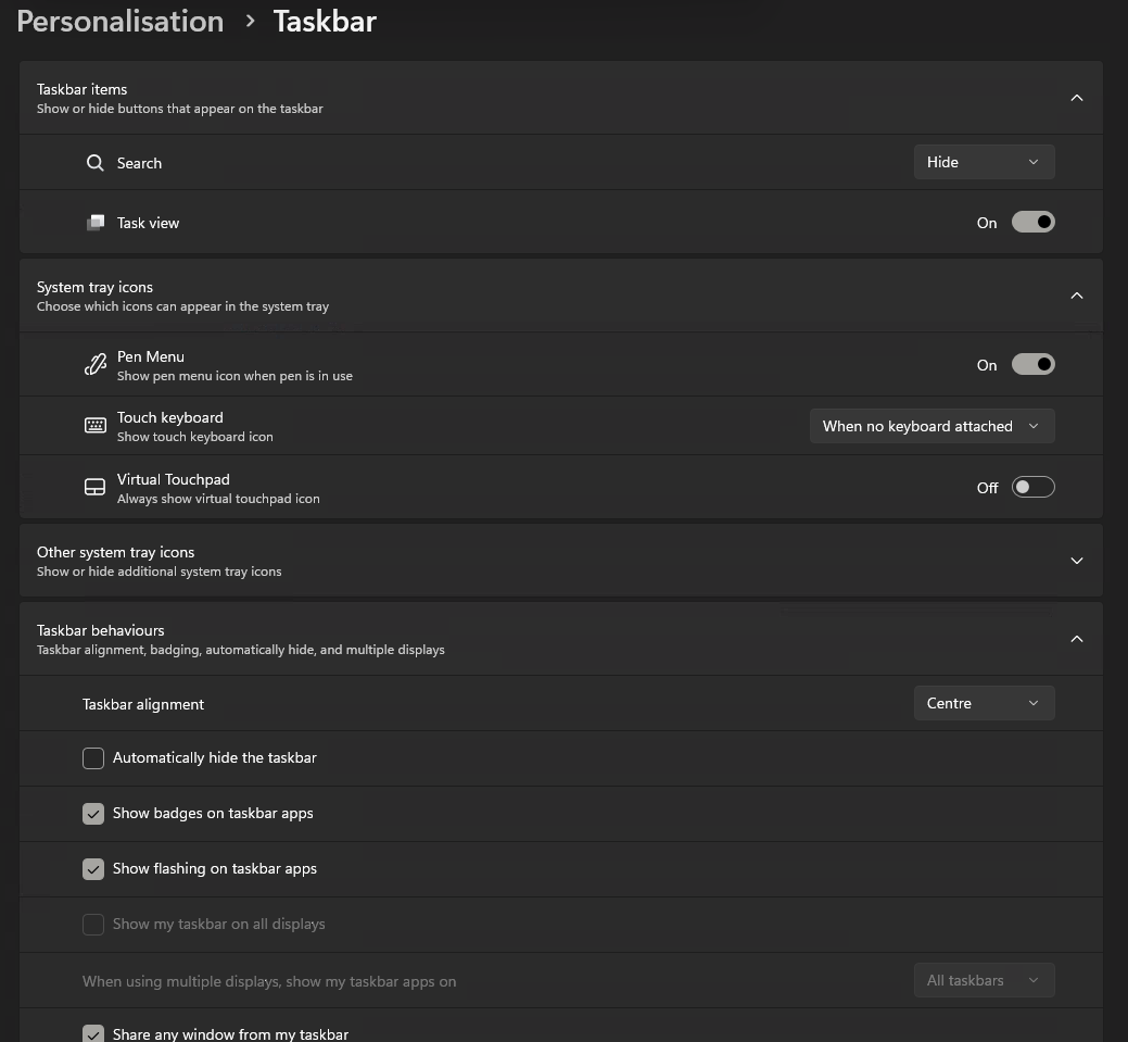 - From here you are able to customise a variety of features such as the icons, search box or the taskbar behaviours to move the taskbar from centre to the left.