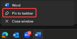 You can drag and drop applications such as Word, PowerPoint etc to the taskbar for easy access in future or simply right click the icon and select “Pin to taskbar” when the application is open.